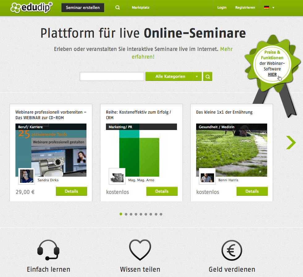 Eine Alternative wäre zum Beispiel das Portal Edudip. Damit lassen sich auch Live-Seminare für bis zu 500 Teilnehmern veranstalten. Aber wer diese auf Youtube stehen haben will, oder hinterher zum Abruf bereitstellen möchte, der muss selbst Hand anlegen, oder 49,00 € im Monat bezahlen. Ein weiterer Nachteil ist die Beschränkung auf maximal 2 (kostenlose) bzw. 4 Moderatoren (kostenpflichtige). Bei Google Hangout hat man bis zu 10 Menschen auf der virtuellen Bühne. Zusätzlich gibt es noch Speichereinschränkungen, die es bei Google nicht gibt.